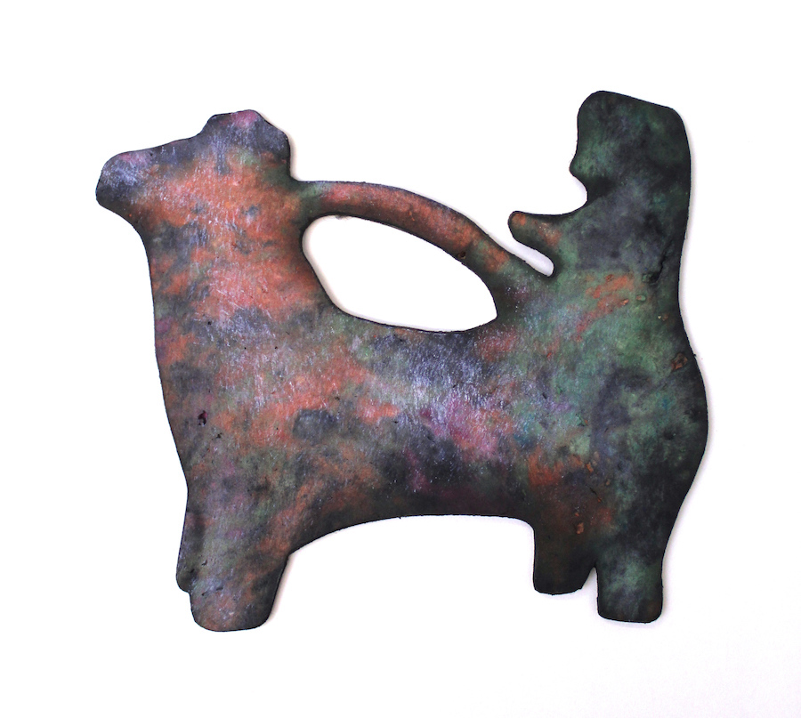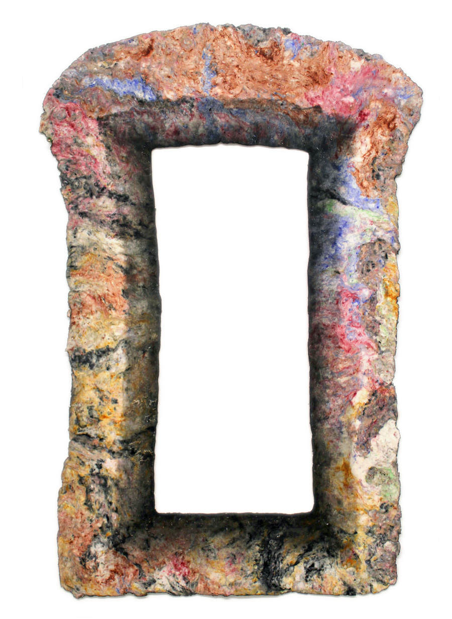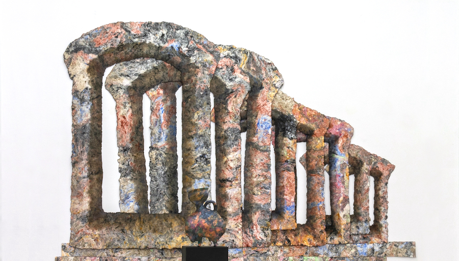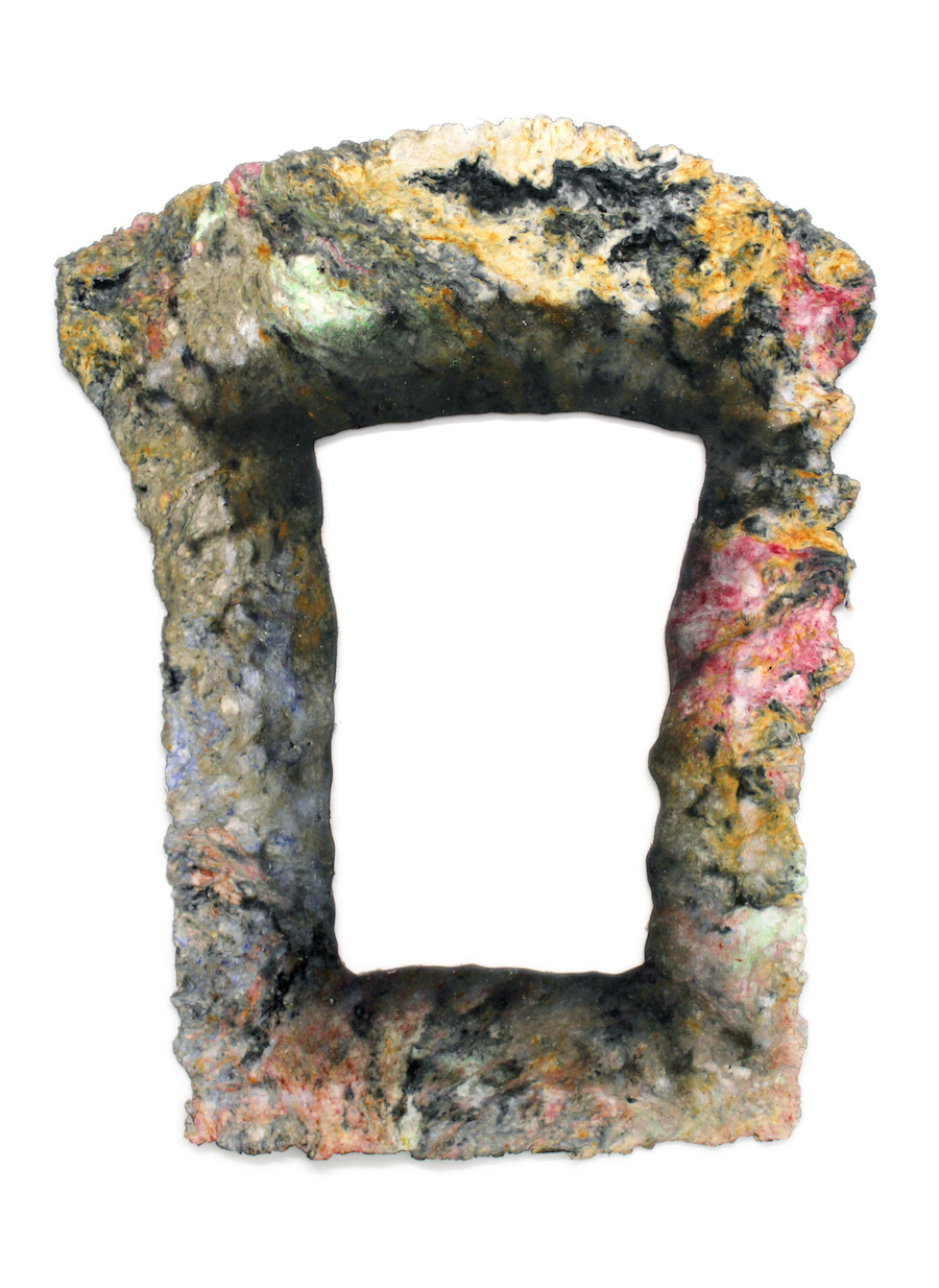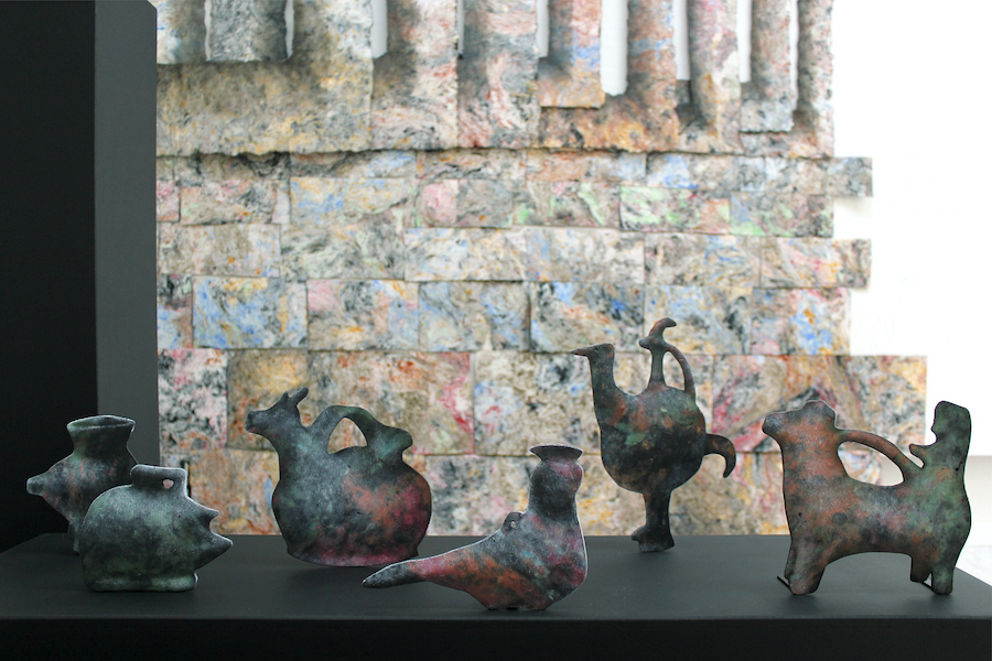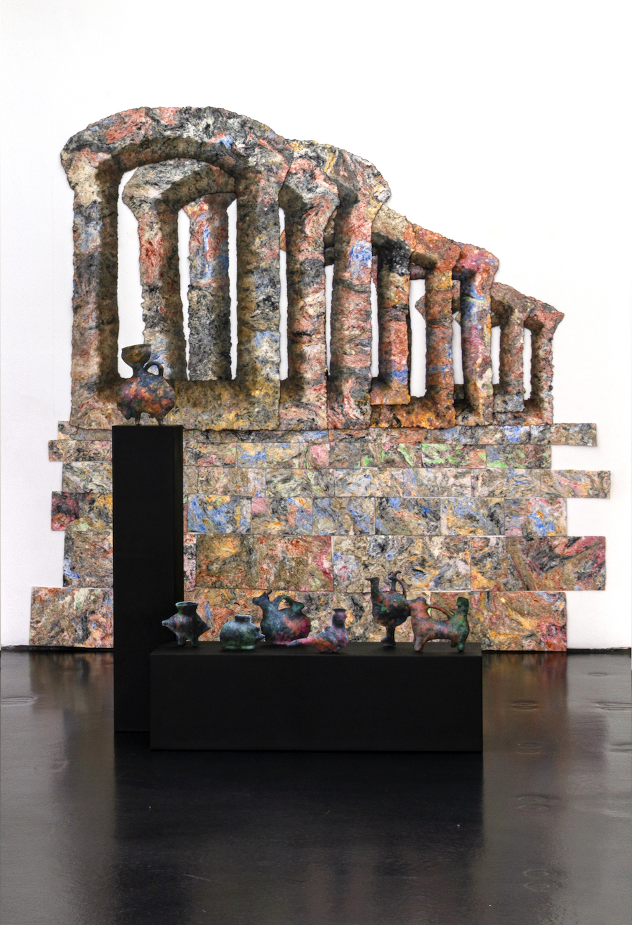 Exhibition view Fast Forward with the installations Portal und Zoomorphic Collection, 2021 235 x 240 x 150 cm, cellulose, pigments, oil paint. Portal/Zoomorphische Sammlung